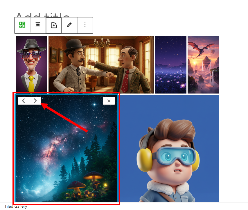 8)갤러리 블록의 아래 표시한곳을 클릭하고 tiled gallery를 선택합니다.
