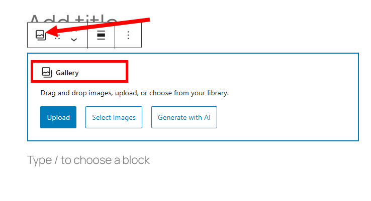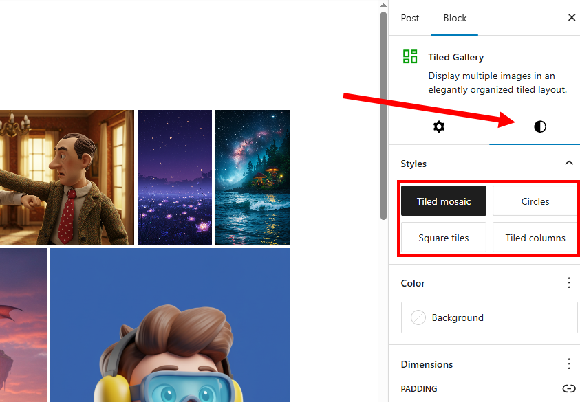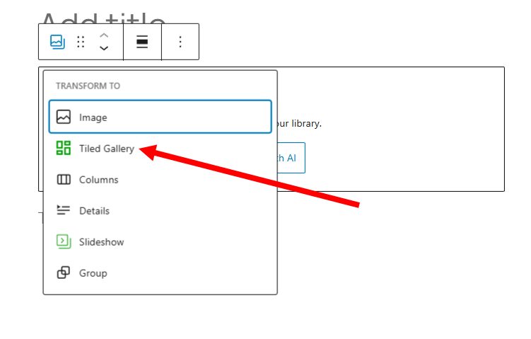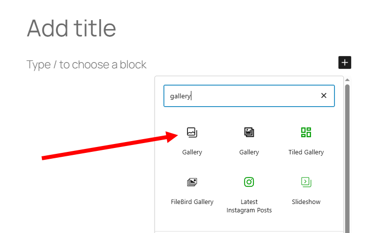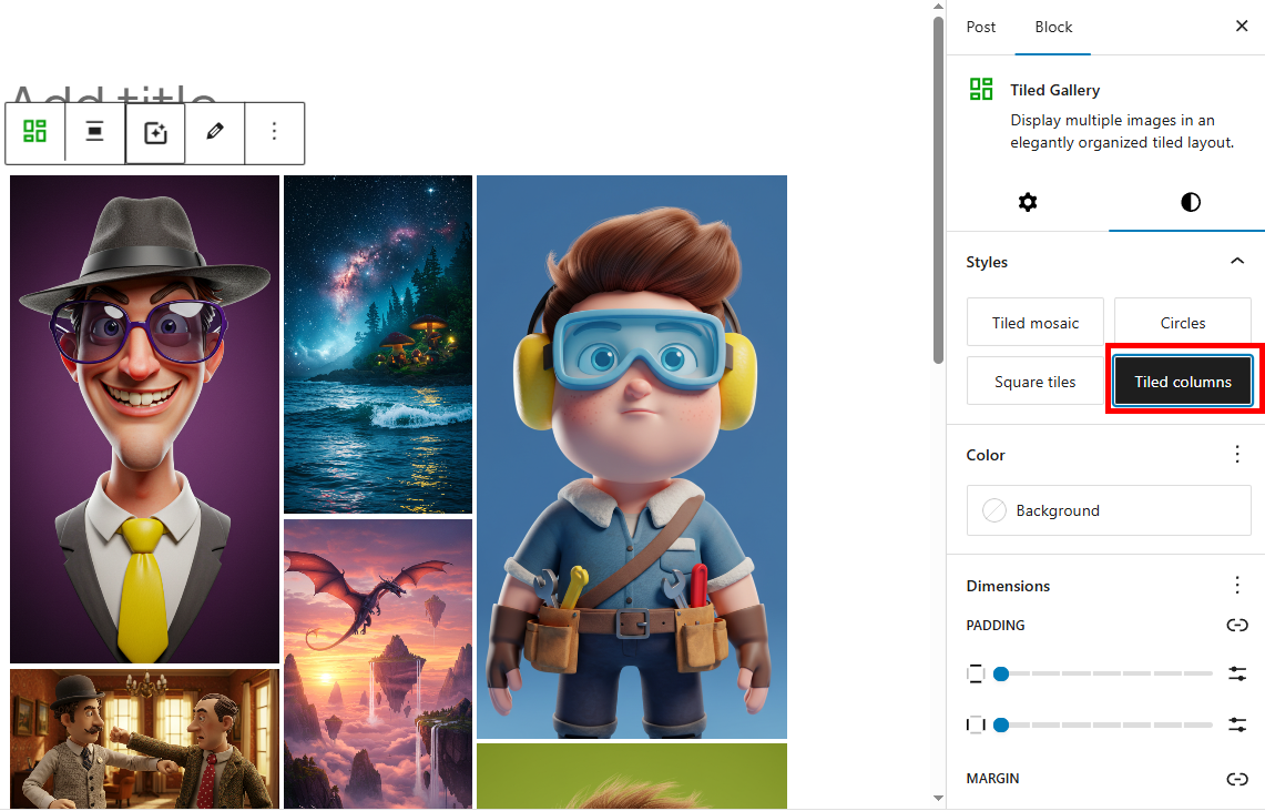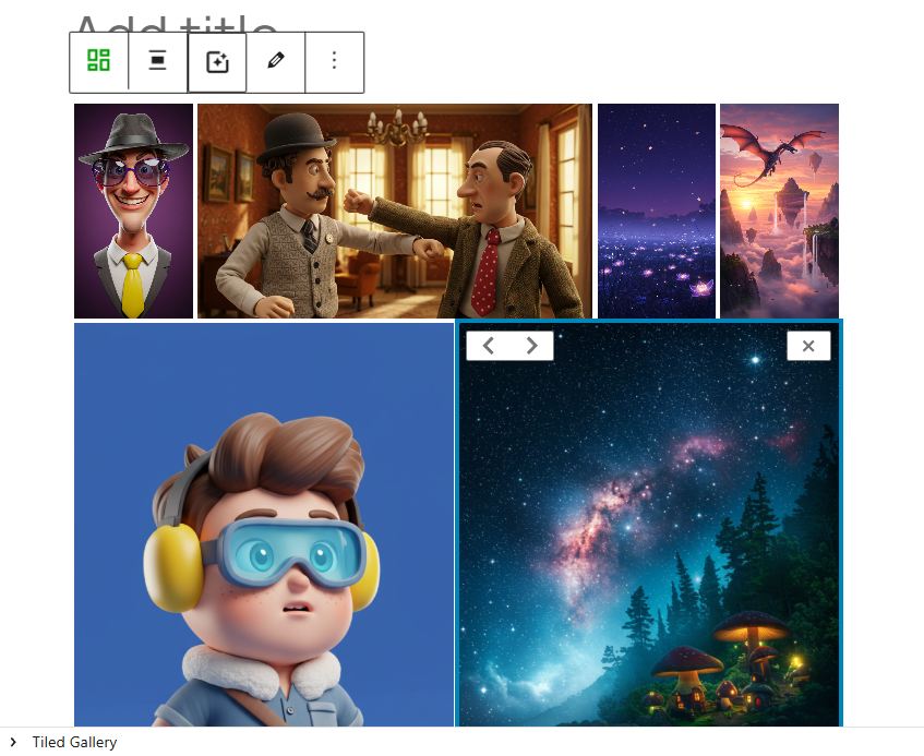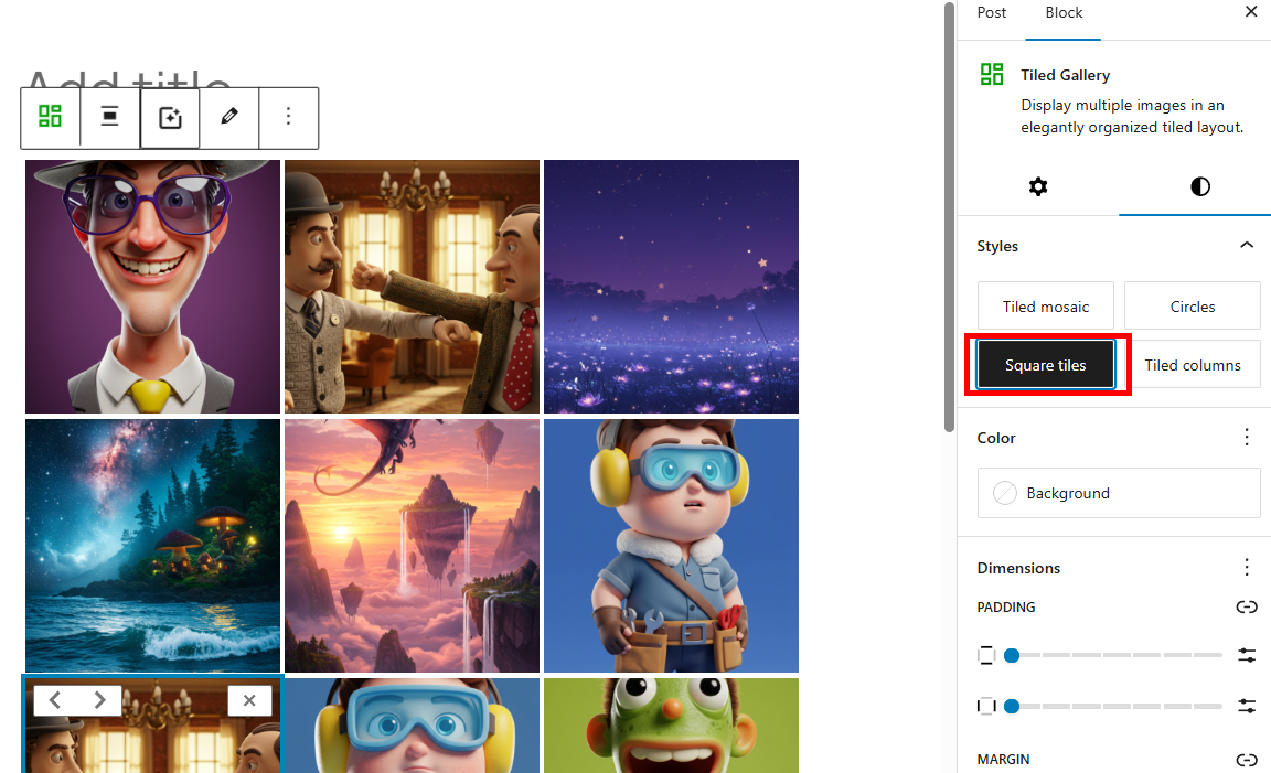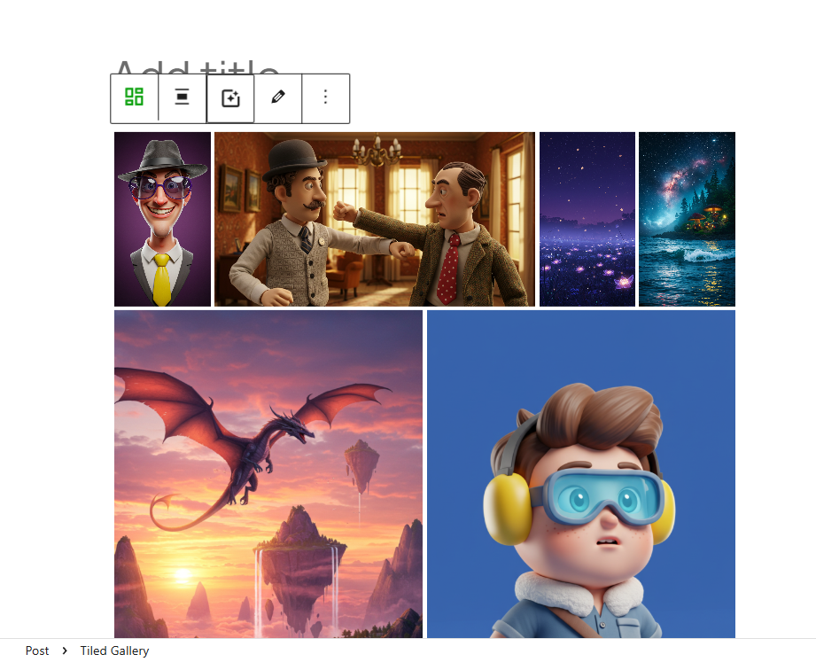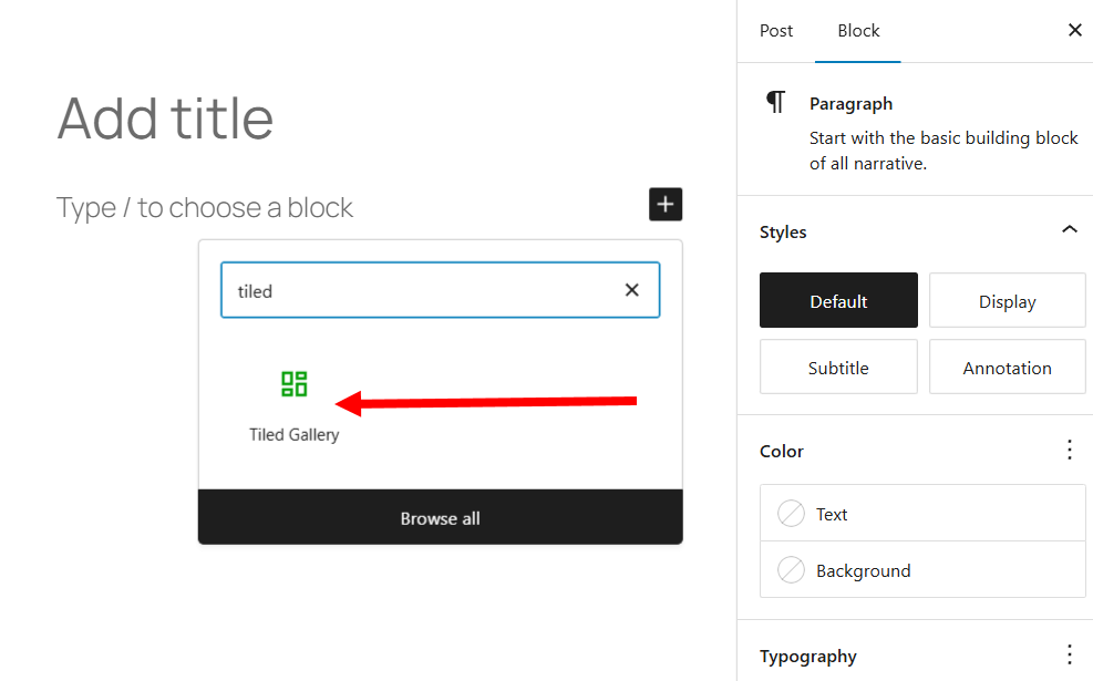 1)게시물 작성에서 tiled gallery 블록을 검색 및 추가합니다.