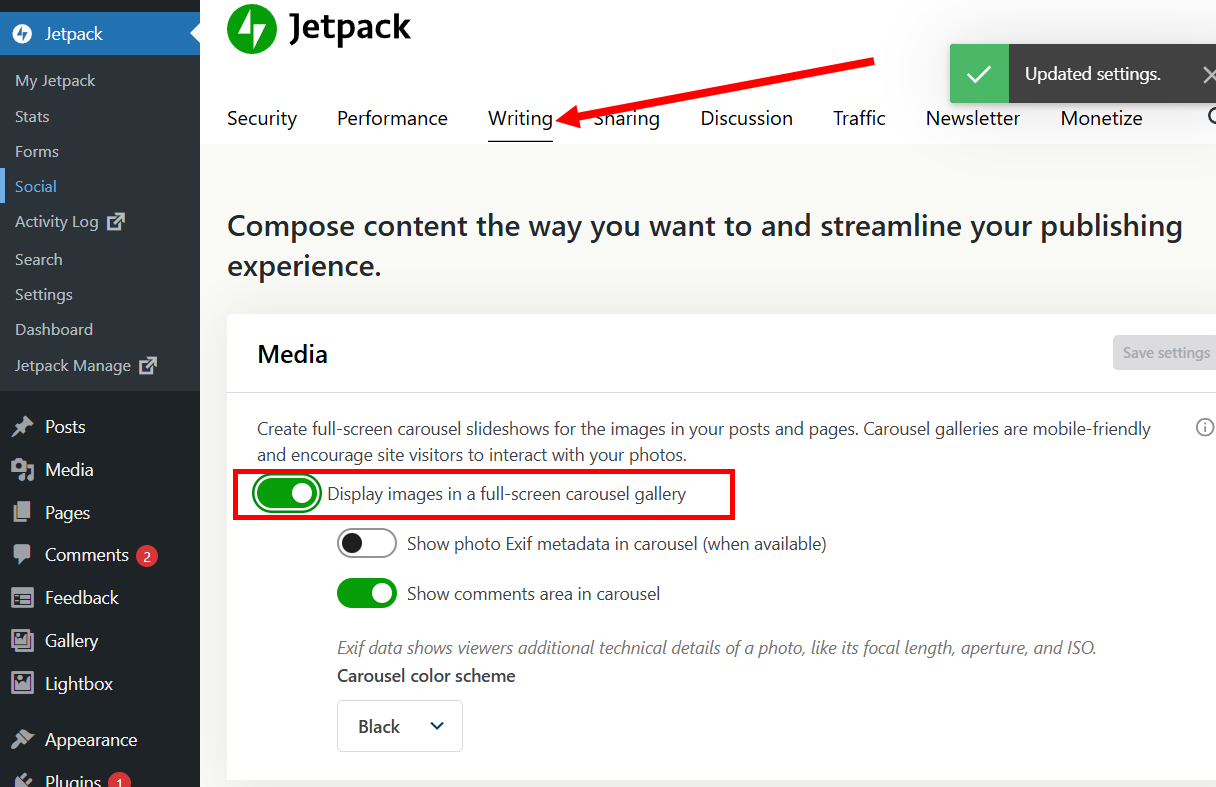 10)타일 갤러리의 이미지를 클릭 및 확대 기능을 활성화하려면 대시보드에서 jetpack 플러그인의 settings 메뉴로이동합니다.
