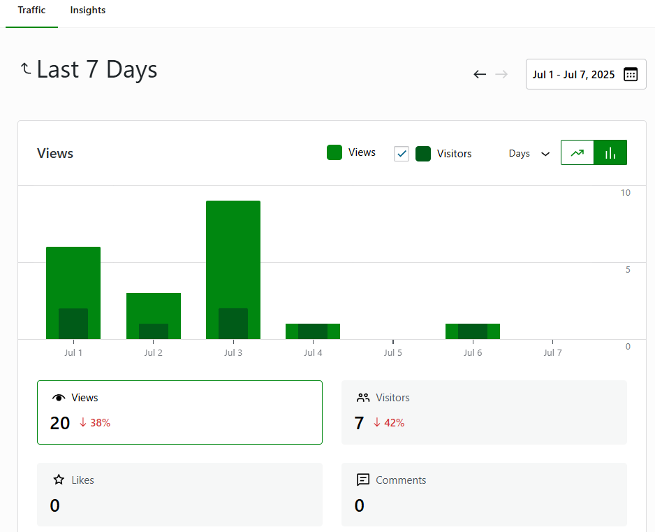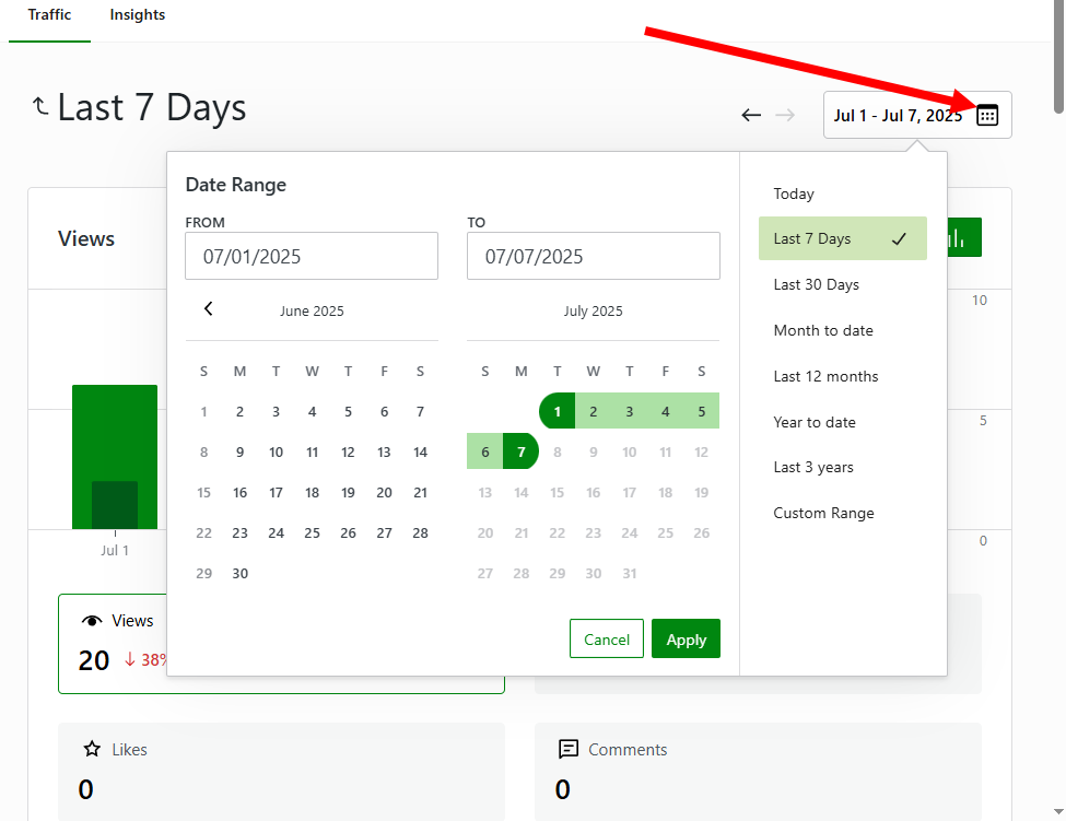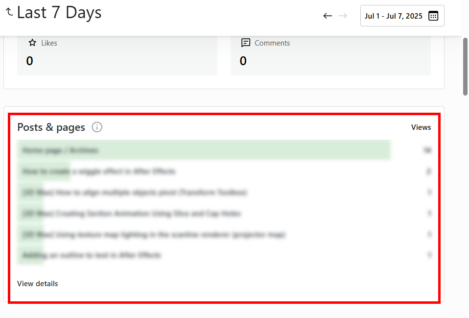 3)선택한 날짜 범위에 대하여 페이지 조회수 및 방문자 수를 표시합니다.