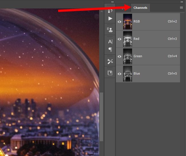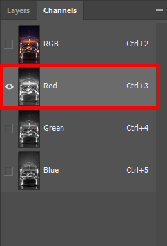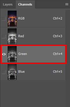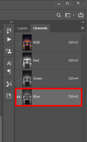3)R, G, B 채널을 각각 활성화하여 이미지의 밝은 영역이 강조된 채널을 확인합니다.