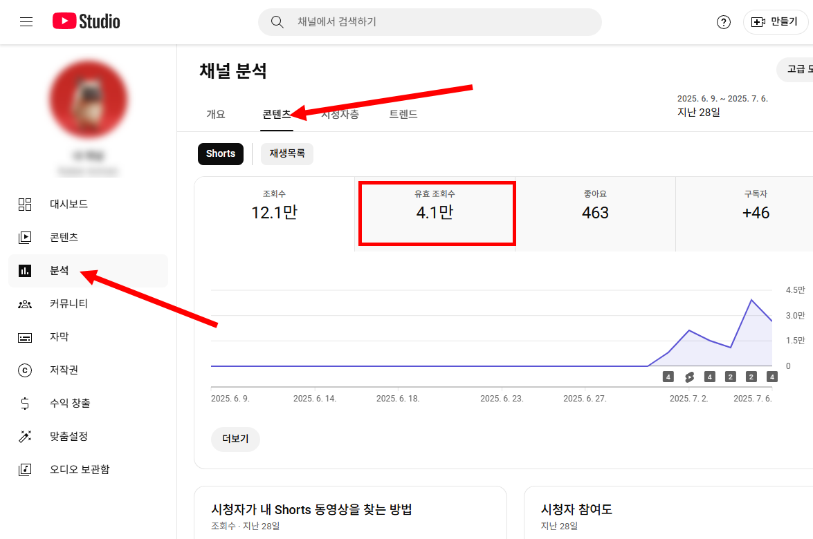 유튜브 스튜디오의 대시보드 또는 분석 메뉴에서 유효 조회수 확인
