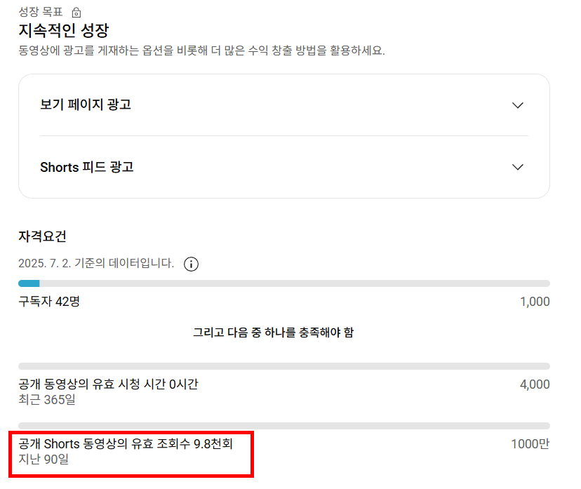 기준 - 유튜브의 유효성 검토 통과 필요(스팸/반복/짧은 체류 제외), 수익이 발생 가능한 Shorts만 포함됨, 일부 조회수가 수익 기준에서 제외될 수 있음