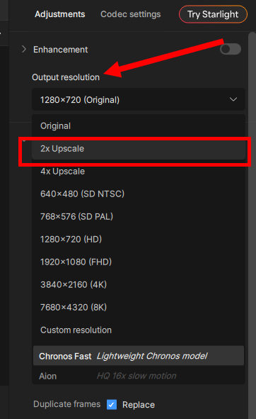 4)동영상 해상도를 업스케일링하려면 output resolution에서 업스케일 해상도를 선택합니다.