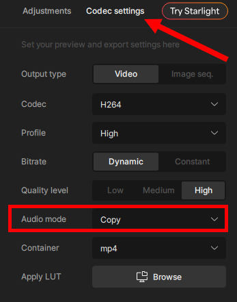 원본 동영상의 오디오를 복사하려면 audio mode에서 copy를 선택합니다(오디오가 존재하지않는 경우 none으로 표시됩니다)