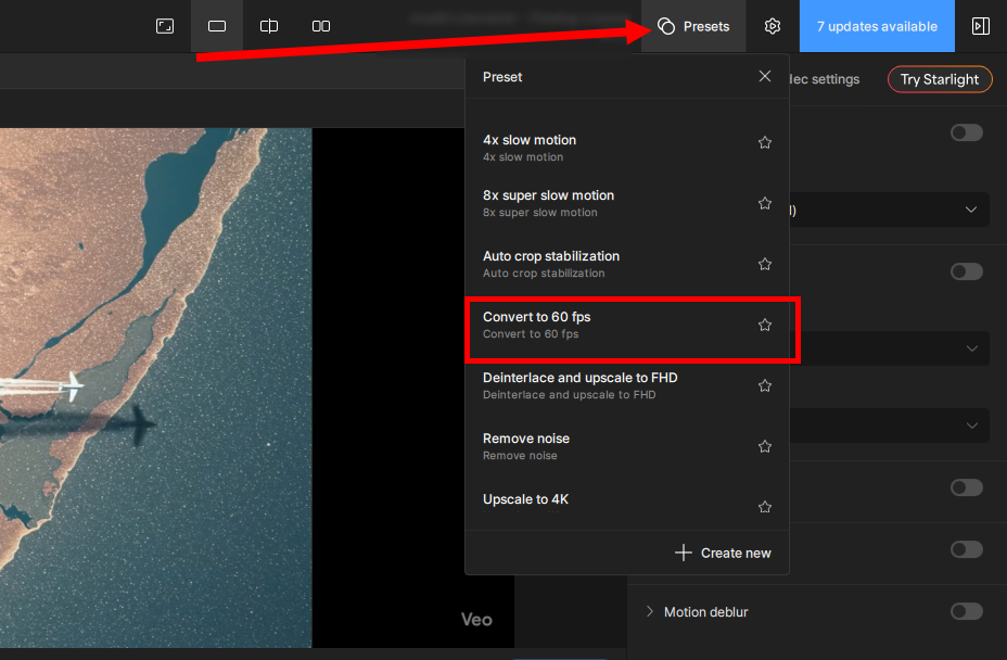 2)프로그램 우측 상단의 presets에서 사전 설정된 프리셋을 선택할수있습니다. 동영상을 60fps로 변환하려면 convert to 60 fps 프리셋을 선택합니다.