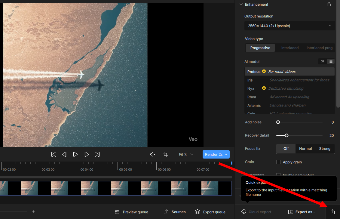 7)현재 설정으로 동영상을 업스케일링 및 내보내기하려면 우측 하단의 quick export를 클릭합니다.