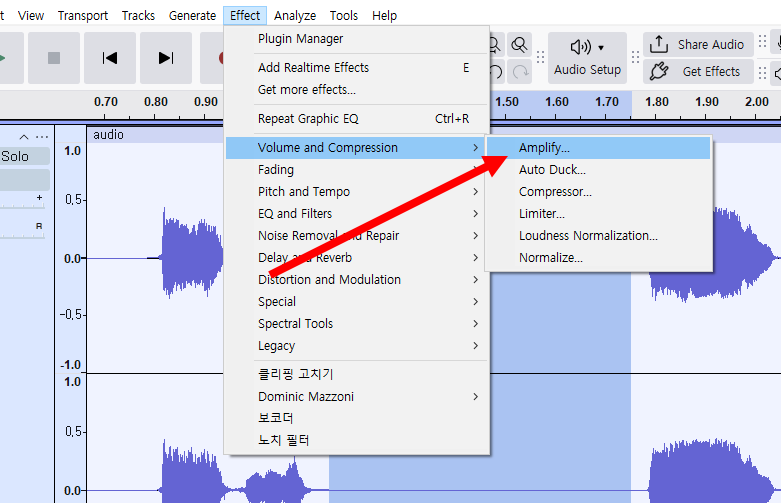 6)상단의 effect 메뉴에서 volume and compression의 amplify로 이동합니다.