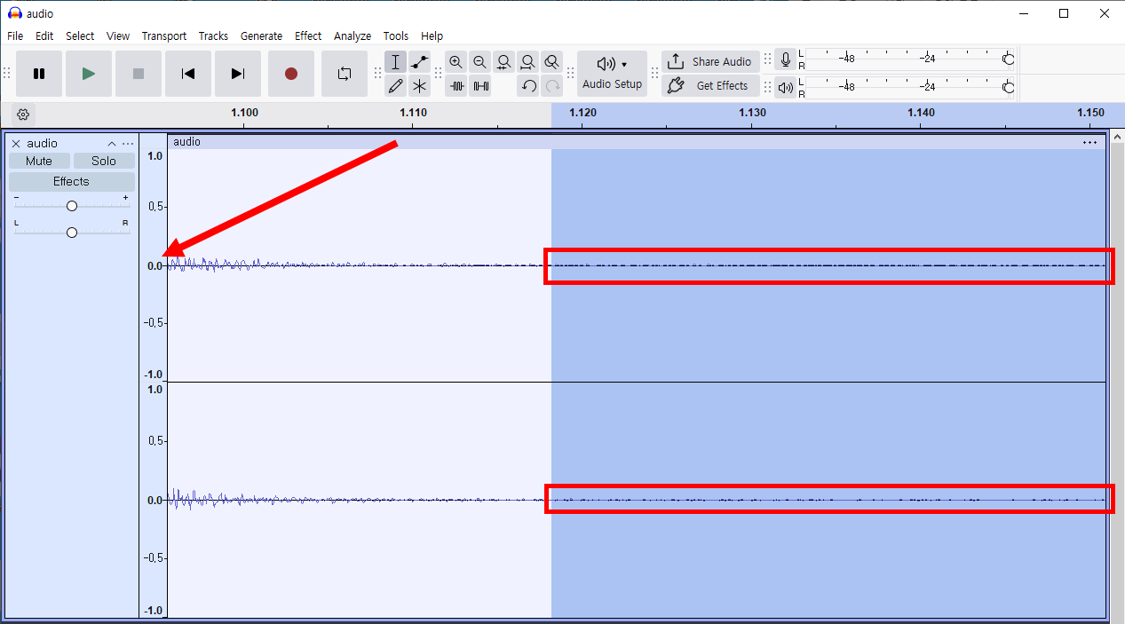 3)특정 구간에서 오디오 신호의 크기가 0에 가깝지만 오디오를 재생하면 노이즈 및 하울링이 존재합니다.