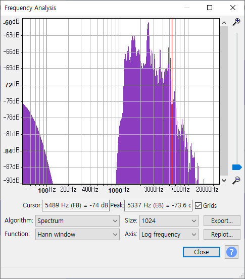 저주파 영역 (<100Hz)에서 매우 미약하게 -75dB 이하의 진폭을 확인할수있으며 특히 약 2kHz ~ 6kHz 사이에 진폭의 피크가 여러 개 존재하는것을 확인할수있습니다. 해당 구간에 지속적인 고주파 신호가 존재하며 하울링 또는 고주파 노이즈의 원인일 수 있습니다.
