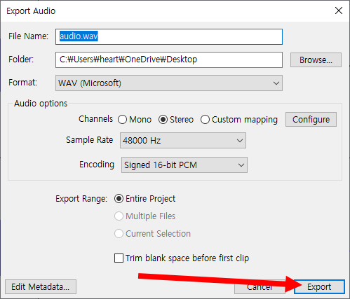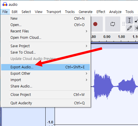 12)작업을 완료한 오디오를 내보내기합니다. 상단의 file 메뉴에서 export audio로 이동합니다.