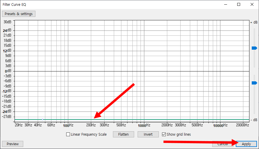 10)주파수 범위에 대해 진폭의 값을 낮추도록 커브를 수정하고 적용합니다.