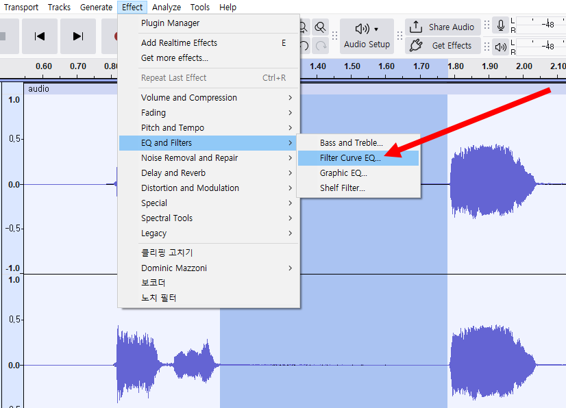 9)상단의 effect 메뉴에서 EQ and Filters의 filter Curve EQ로 이동합니다.