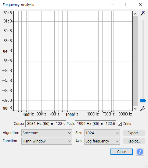 5)인간의 가청 주파수( 20Hz ~ 20kHz) 범위에서 주파수 Hz (X축)에 대한 진폭 dB(Y축, -60dB에서 -90dB 사이)의 크기와 그래프를 표시합니다.
