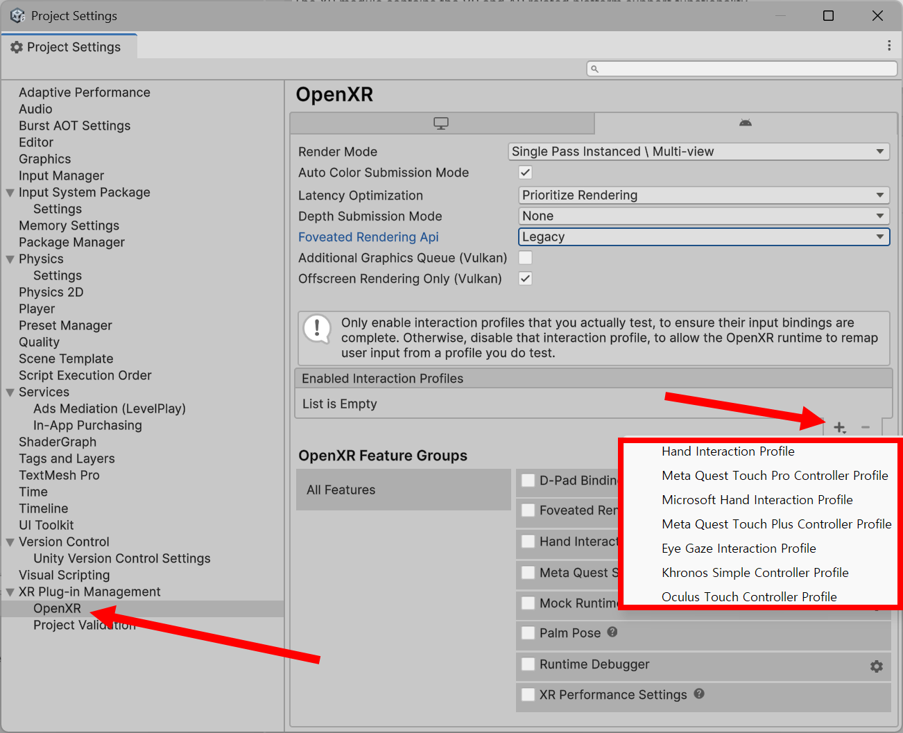 OpenXR 메뉴의 Enabled Interaction Profiles에서 상호작용 프로필이 추가될수있습니다.