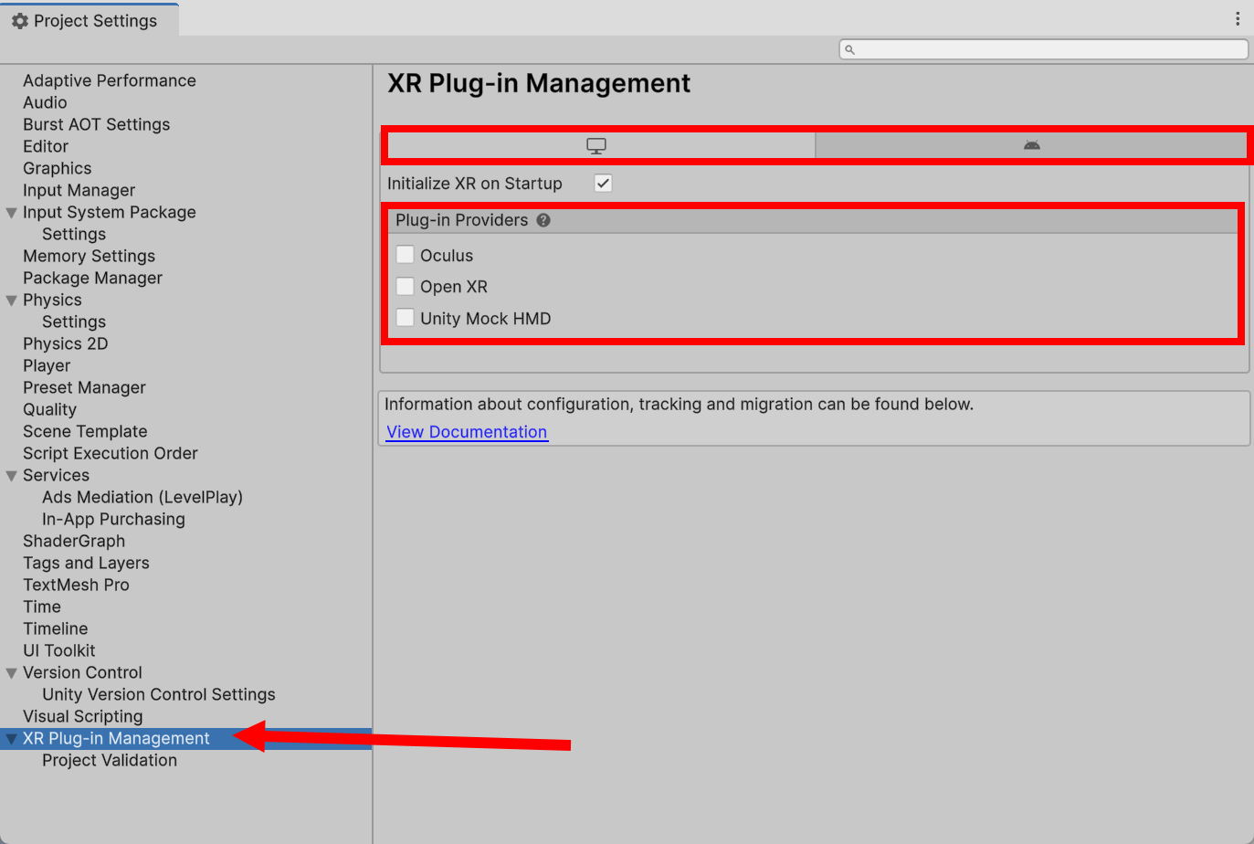 상단 탭에는 빌드 대상 플랫폼(Android, iOS, Windows, Mac, Linux)이 표시되며 프로젝트에서 대상 플랫폼에 따라서 사용할 XR 플러그인을 적절히 선택하고 구성할 수 있습니다.