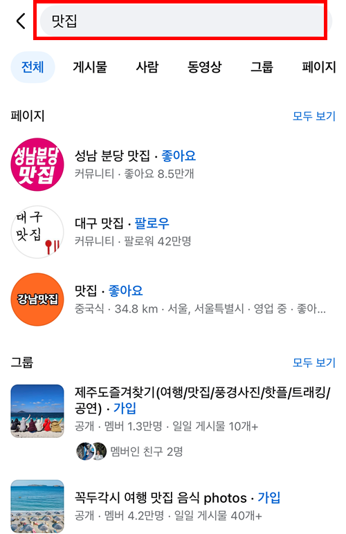 2)키워드를 입력 및 검색합니다. 해당 키워드의 검색 결과를 표시합니다(게시물, 페이지, 그룹등)
