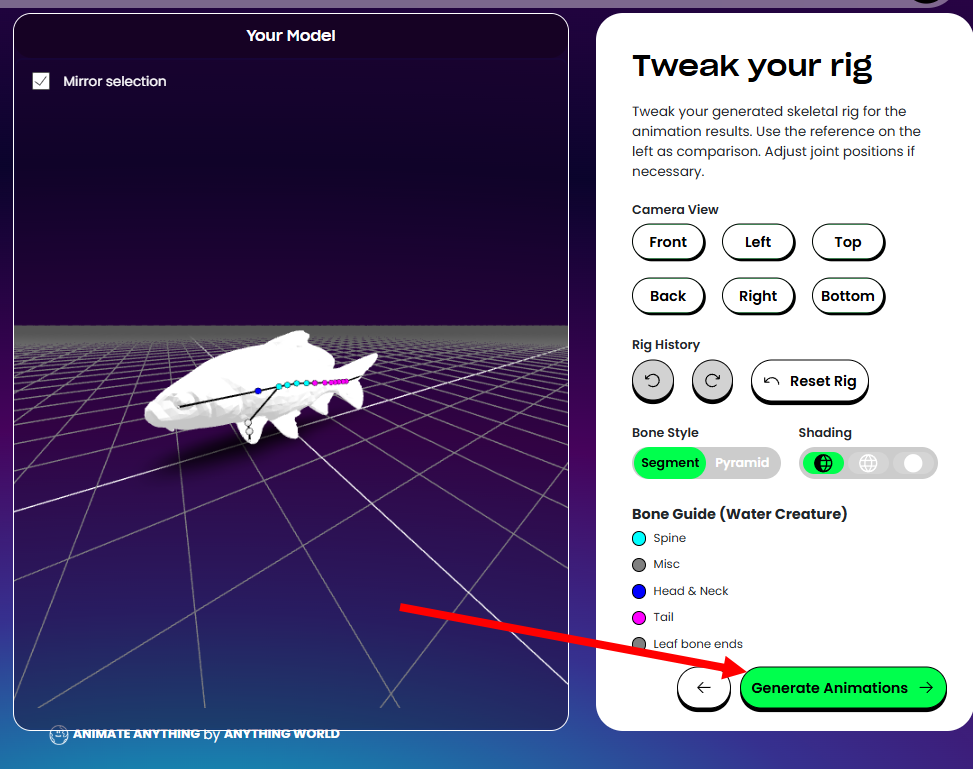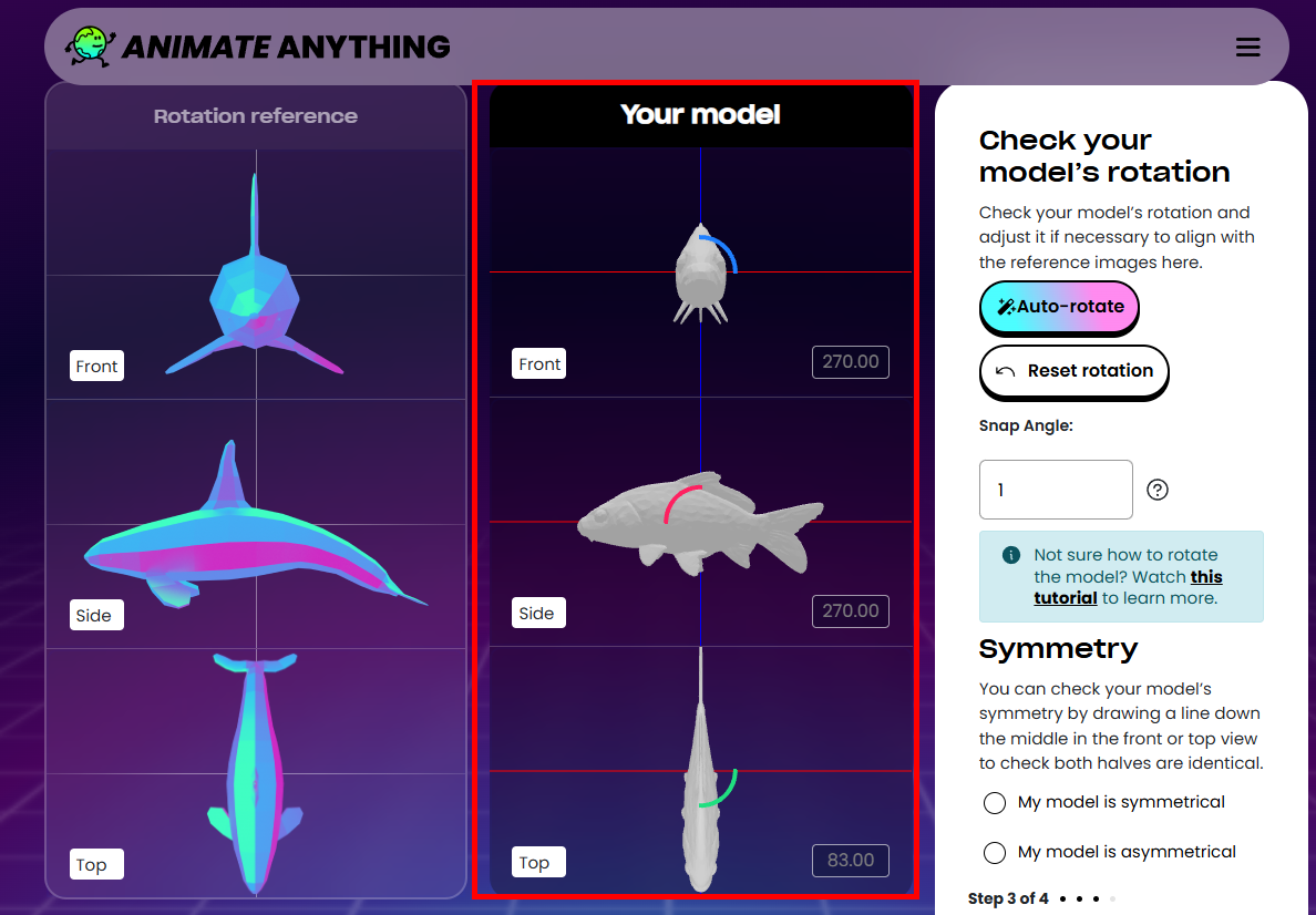 사람(바이패드) 뿐만 아니라 네발 동물, 곤충, 새, 물고기등 3D 모델을 자동으로 리깅하고 애니메이션을 생성해주는 웹사이트입니다.