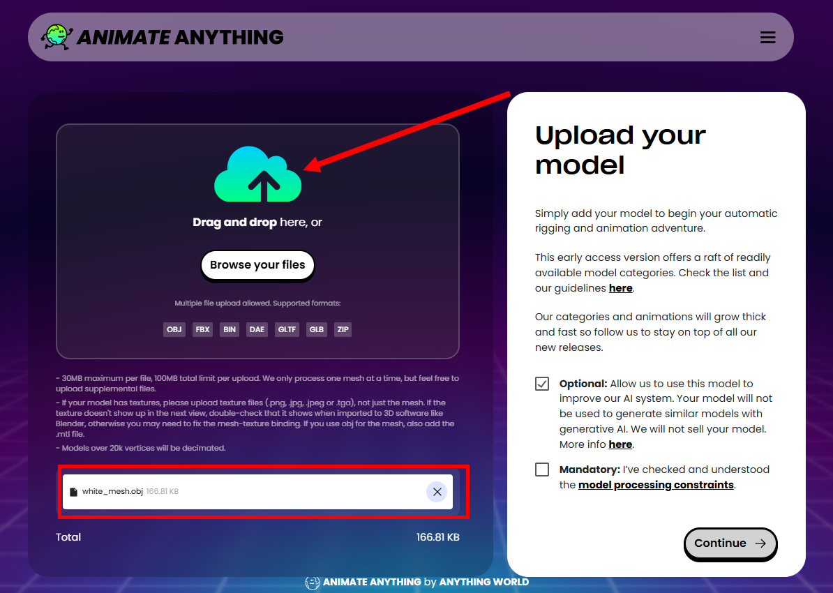 3)리깅 및 애니메이션을 생성하려는 3D 모델 파일을 업로드합니다. 지원하는 3D 모델 제한사항을 확인합니다(파일 형식, 파일 크기)