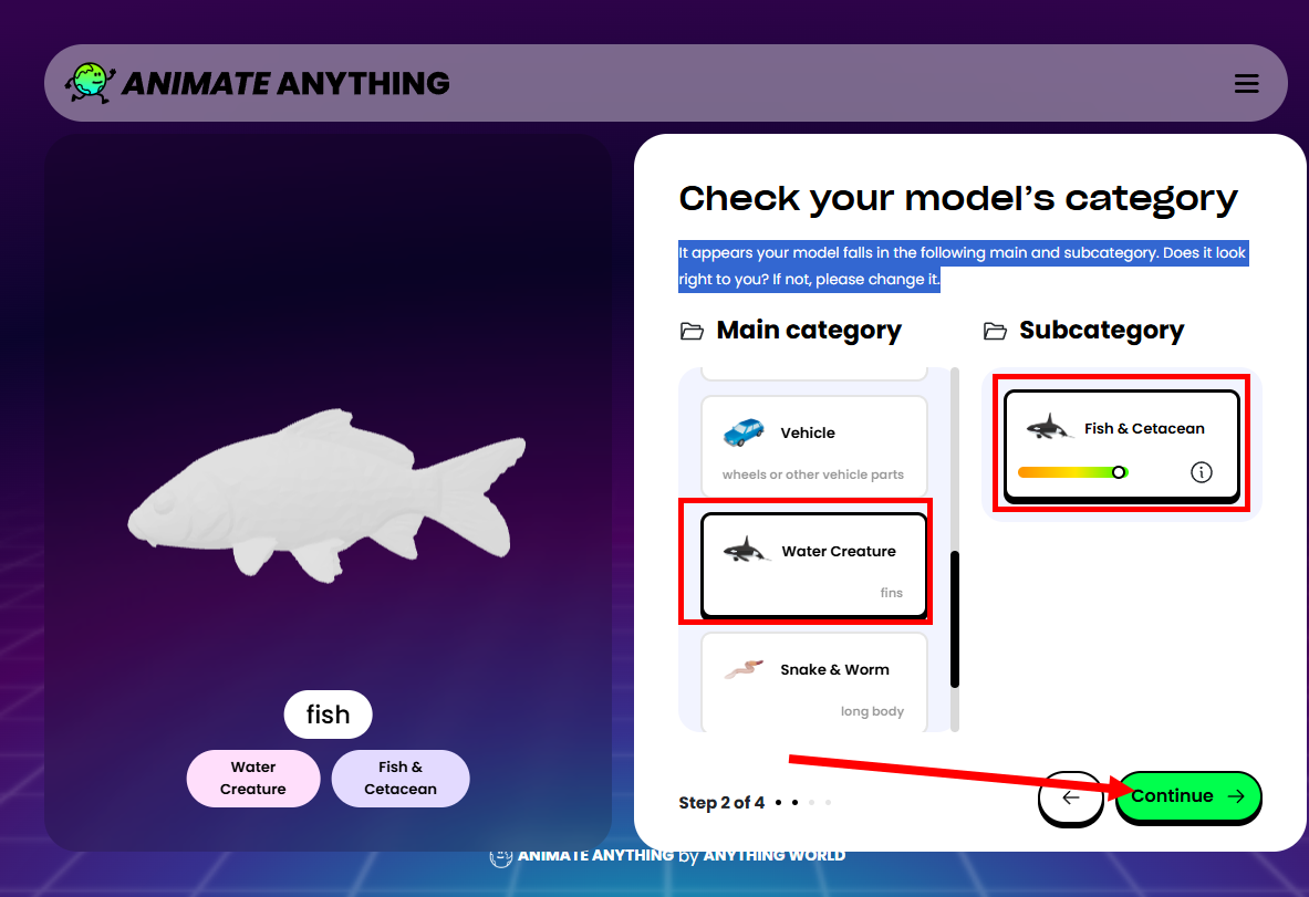 6)모델의 카테고리 (main category, subcategory) 를 선택합니다(바이패드, 네발동물, 곤충, 새, 차량, 물고기, 지렁이, 기타)
