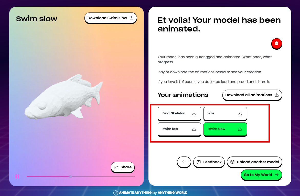 13)3D 모델의 애니메이션이 생성된것을 확인할수있습니다. 모델이 물고기 유형(fish type)인 경우 idle, swim fast, swim slow 애니메이션이 생성됩니다.