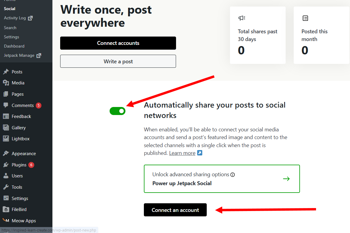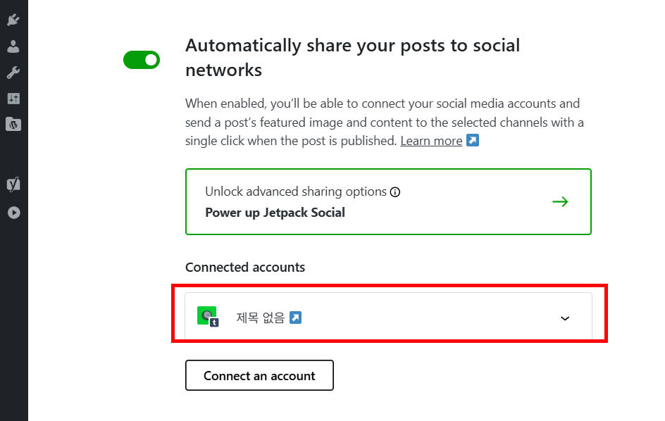 2)소셜 네트워크에 자동 게시물 공유를 사용하려면 automatically share your posts to social networks를 활성화화하고 connect an account로 이동합니다.