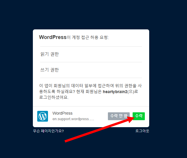 5)워드프레스 계정 접근 허용 요청을 수락합니다.