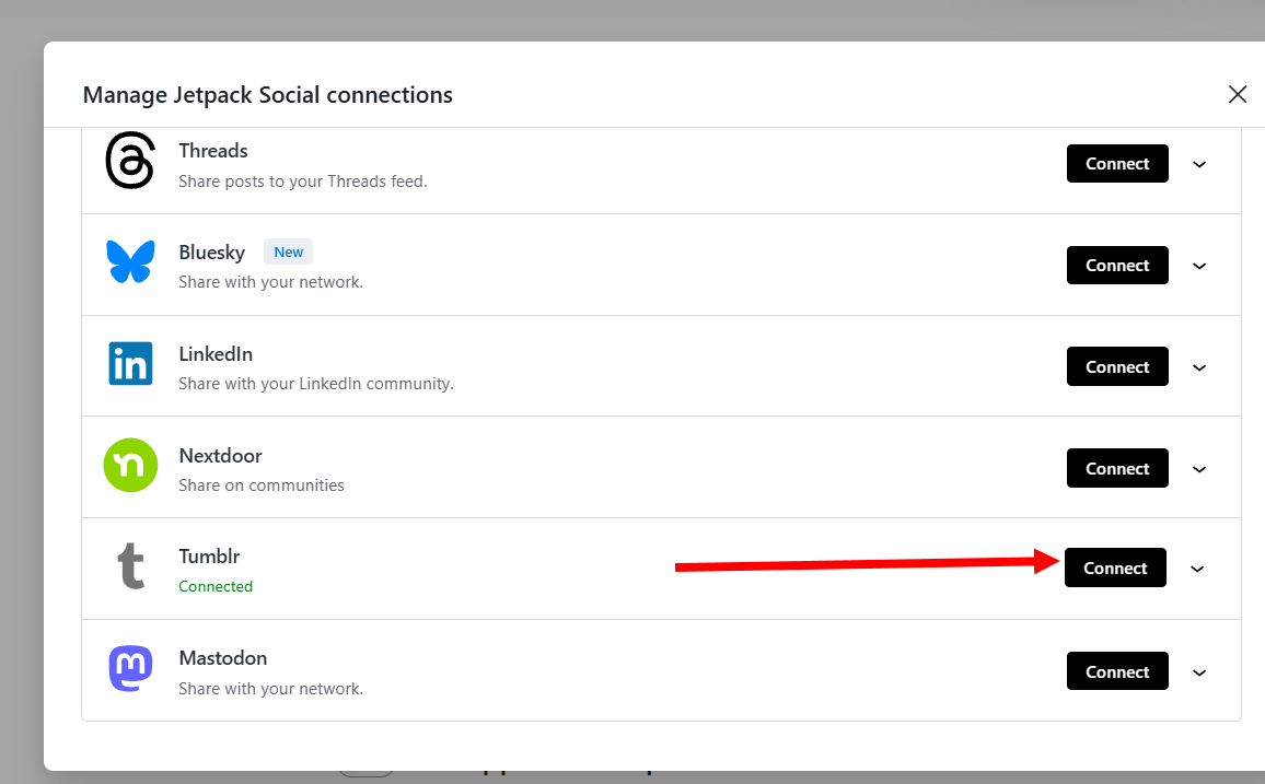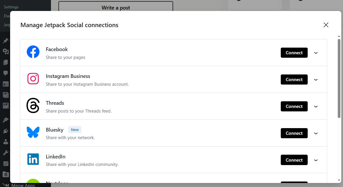 3)제트팩 소셜에 연결할수있는 소셜 플랫폼 목록을 확인할수있습니다.