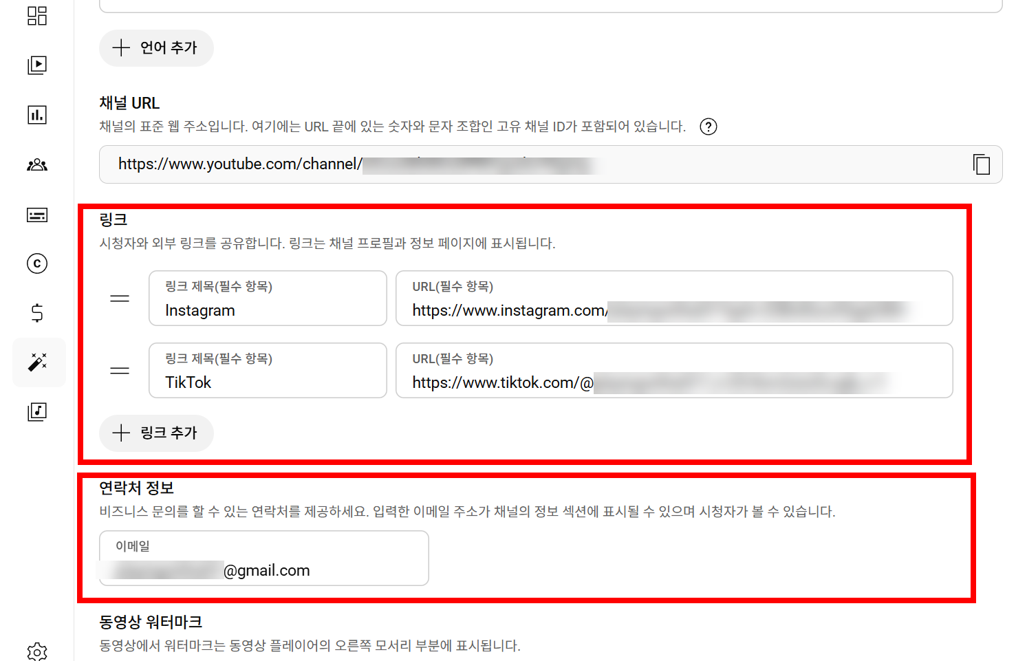 연락처 정보에 채널의 정보섹션에 표시 및 공개될 이메일 주소를 입력합니다.