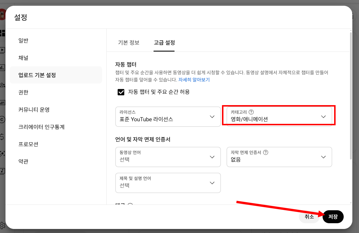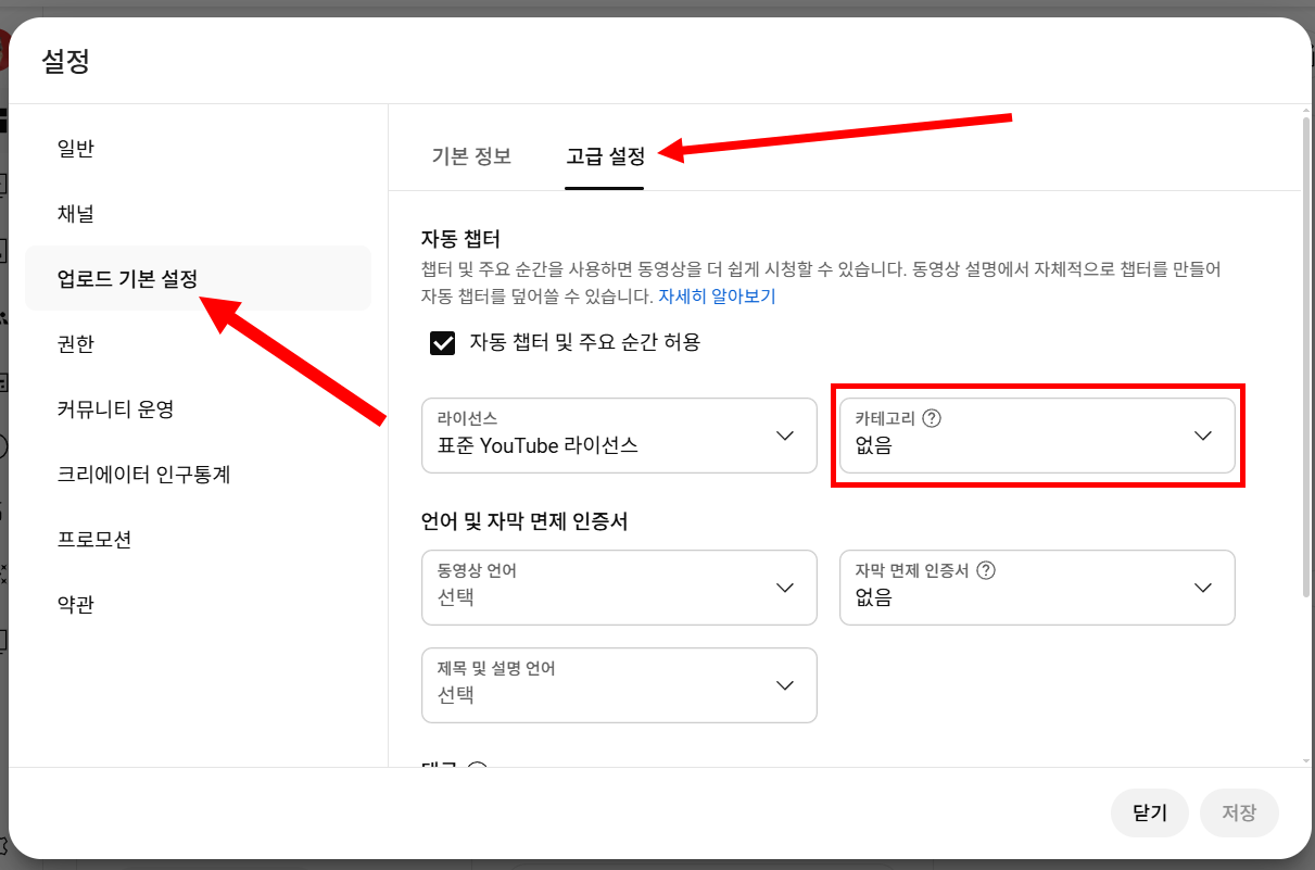 10)좌측 업로드 기본 설정의 고급설정에서 채널의 카테고리를 선택합니다.