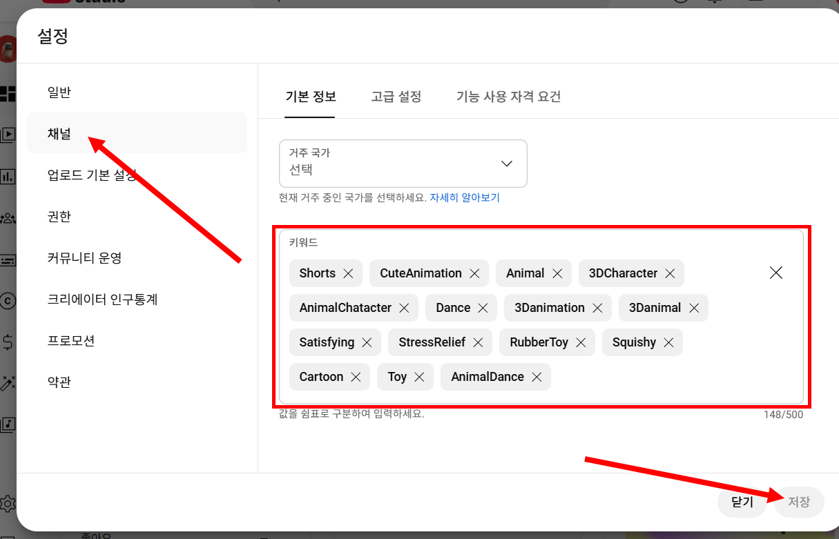 8)좌측 채널 메뉴의 기본 정보에서 키워드를 입력합니다. 유튜브 채널에 대해 잘 나타낼수있는 키워드를 입력합니다(쉼표로 구분하여 입력)