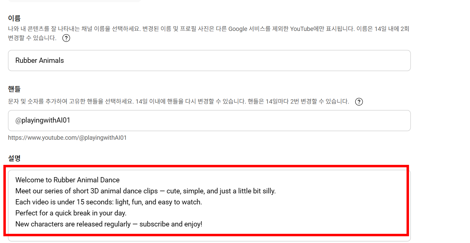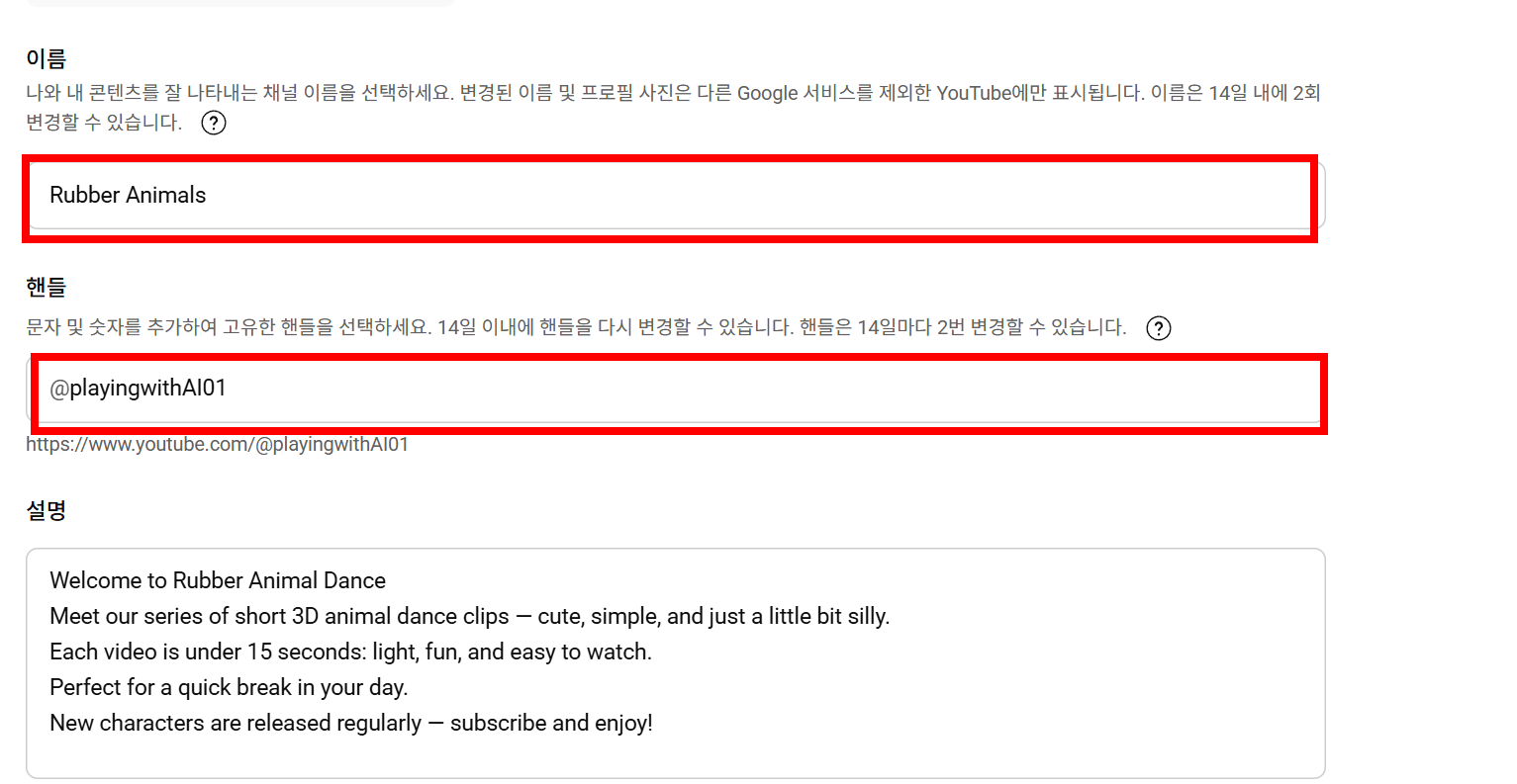 이름 - Rubber Animals, 채널 이름(유튜브 채널과 콘텐츠를 잘 나타낼수있는 이름을 설정), 자유롭게 입력(띄어쓰기 가능, 대문자, 기호등), 다른 채널과 이름 중복 가능, 14일 이내에 2회 변경 가능
