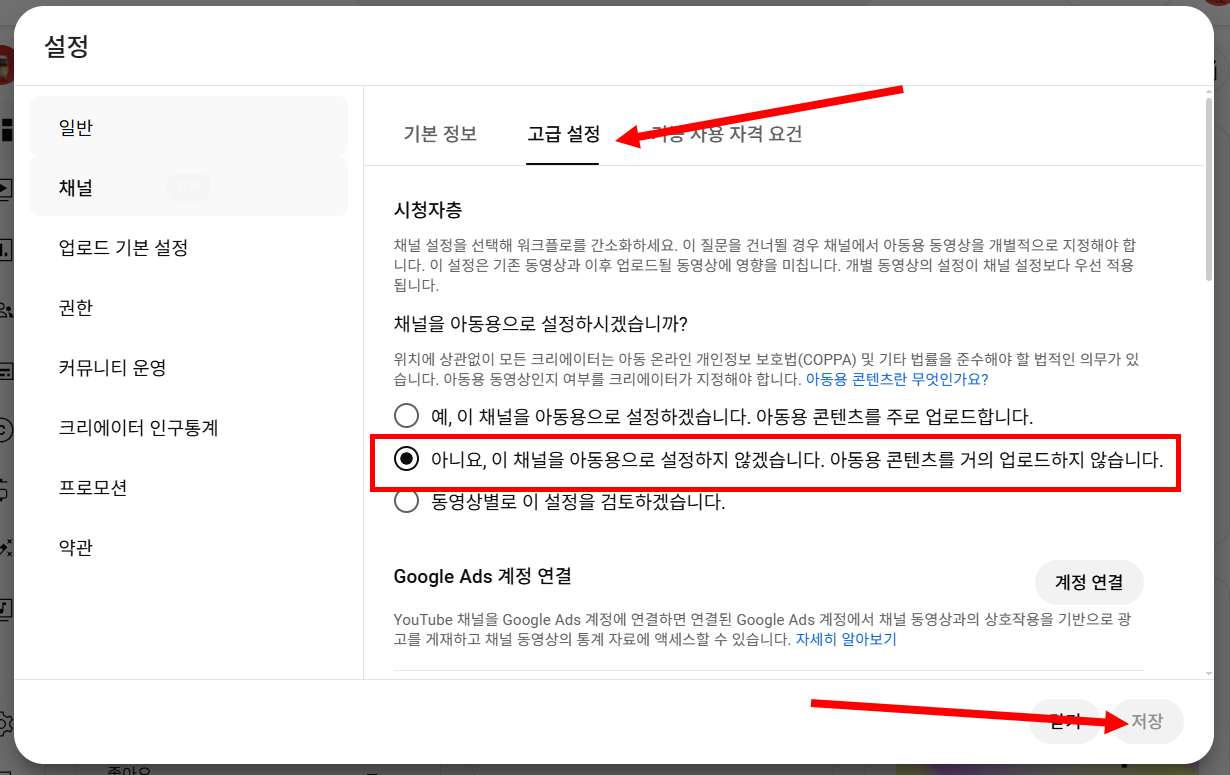 9)고급 설정에서 시청자층의 아니요, 이 채널을 아동용으로 설정하지않겠습니다. 아동용 콘텐츠를 거의 업로드하지 않습니다에 체크합니다.