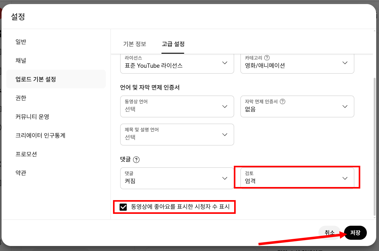 11)하단에서 댓글 검토 수준을 선택하고 동영상에 좋아요를 표시한 시청자 수 표시할지 여부를 선택하고 저장합니다.