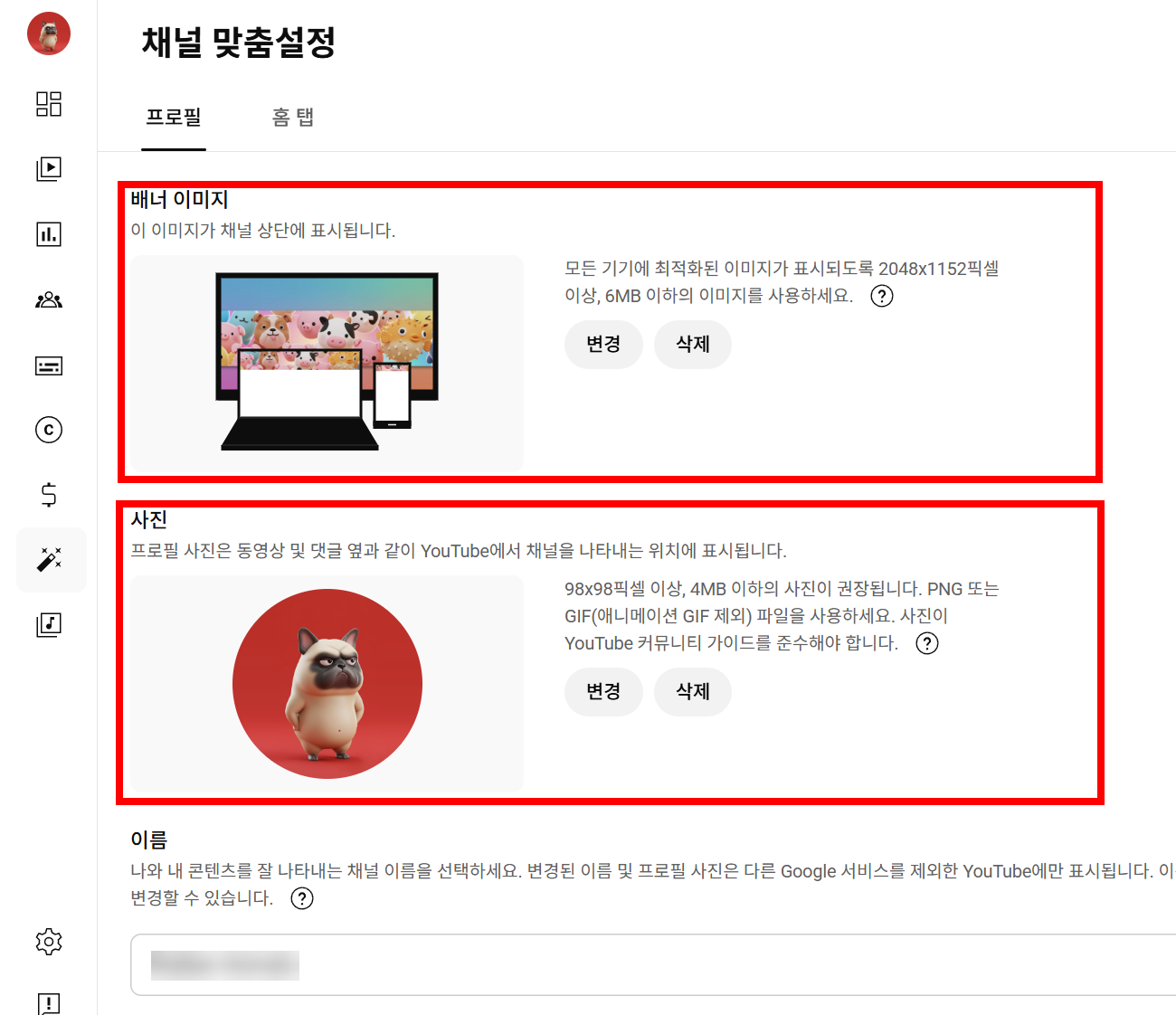 채널 맞춤설정(배너 이미지, 프로필 사진, 이름, 핸들, 설명, 링크, 연락처정보)