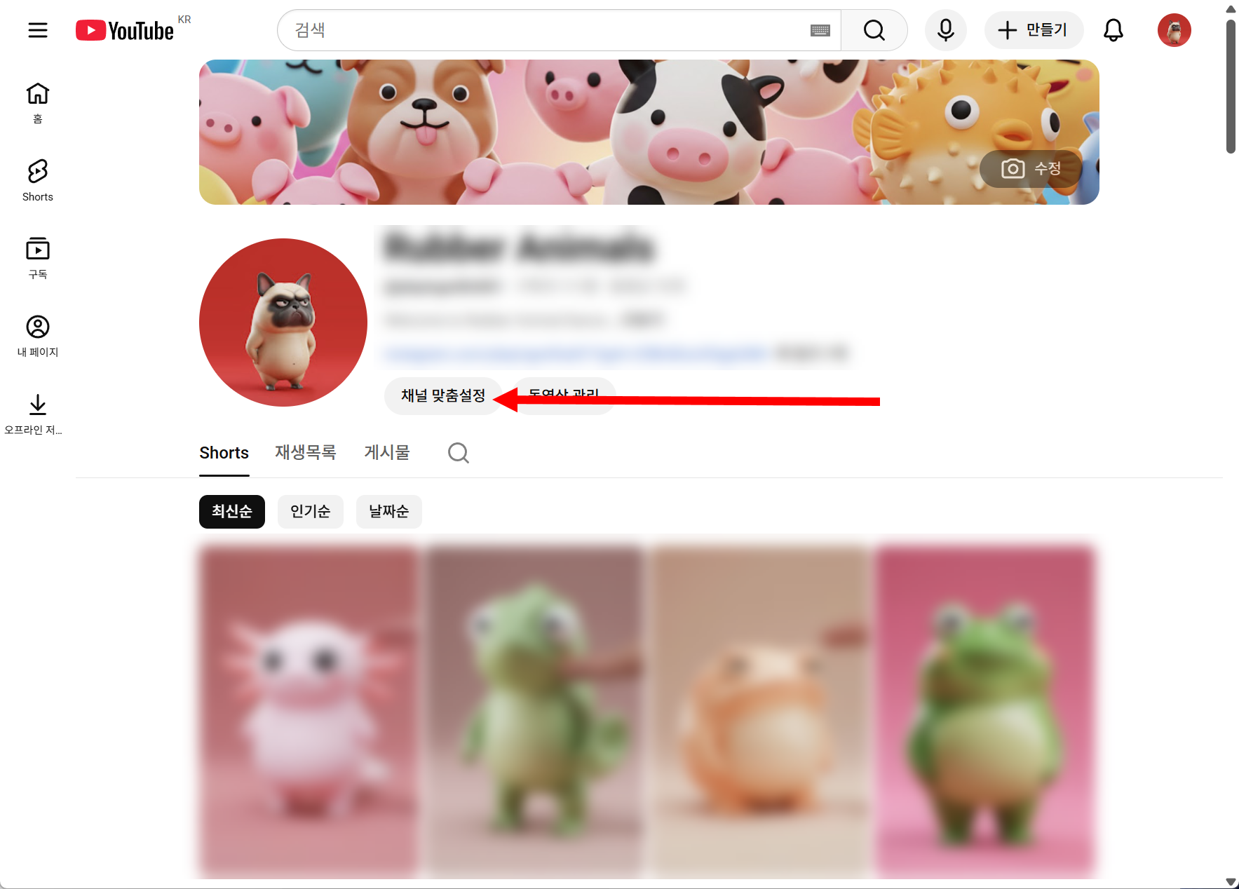 1)유튜브 채널의 채널 맞춤설정으로 이동합니다.