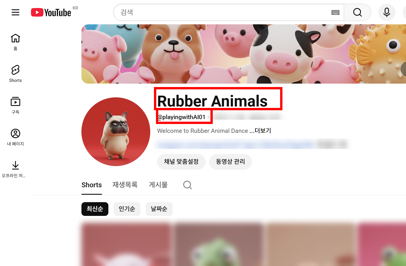 유튜브 채널에서 이름과 핸들이 표시되는 부분