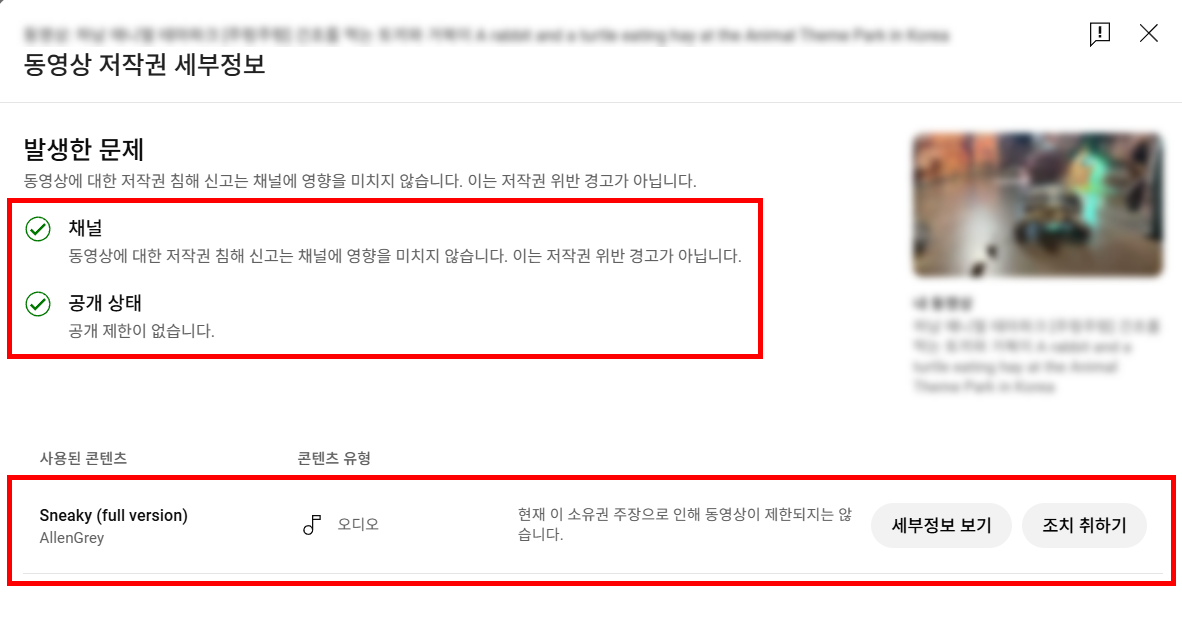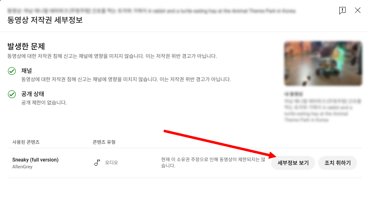 3)동영상 저작권 세부정보에서 발생한 문제를 확인합니다. 이 문제는 채널에 영향을 미치지않으며(저작권 위반 경고가 아님) 공개 제한이 없음을 확인할수있습니다.