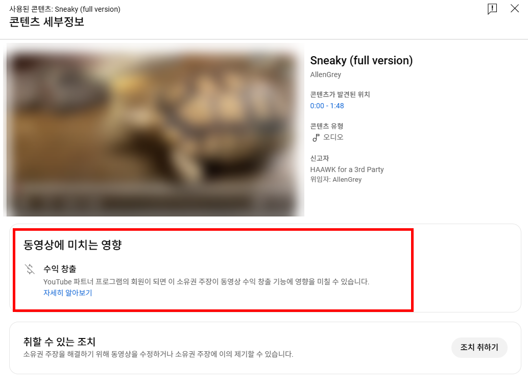 5)콘텐츠 세부정보에서 동영상에 미치는 영향을 확인할수있습니다. 수익창출은 동영상에 포함된 해당 콘텐츠의 소유권 주장이 수익창출 기능에 영향을 미칠수있음을 의미합니다.