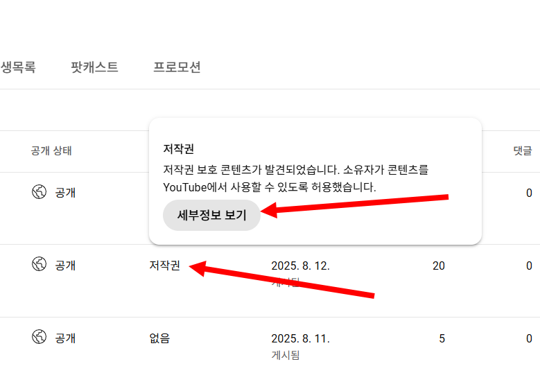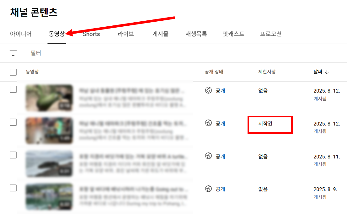 1)유튜브 채널에 업로드한 동영상 목록에서 현재 특정 동영상의 제한사항에 저작권이라고 표시되는것을 확인할수있습니다. 저작권 제한사항은 동영상이 저작권 보호 콘텐츠를 포함하며 저작권의 소유자가 해당 콘텐츠를 유튜브에서 사용할수있도록 허용했음을 의미합니다.