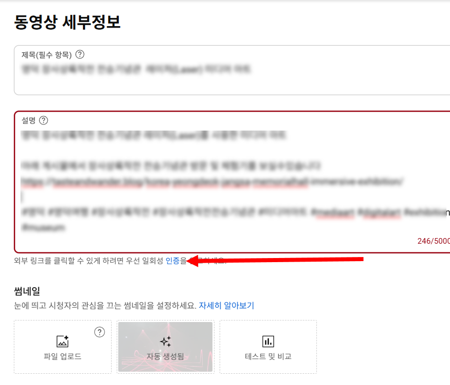 3)외부 링크를 클릭할수있게 하려면 인증을 진행해야합니다. 동영상 세부정보 설명 하단에 있는 인증으로 이동합니다.