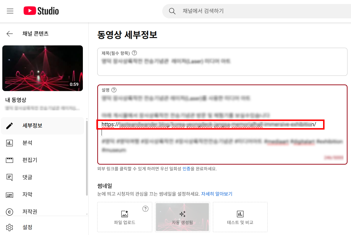 2)업로드한 동영상의 설명에서 사이트 주소의 링크 클릭이 비활성화되있습니다.