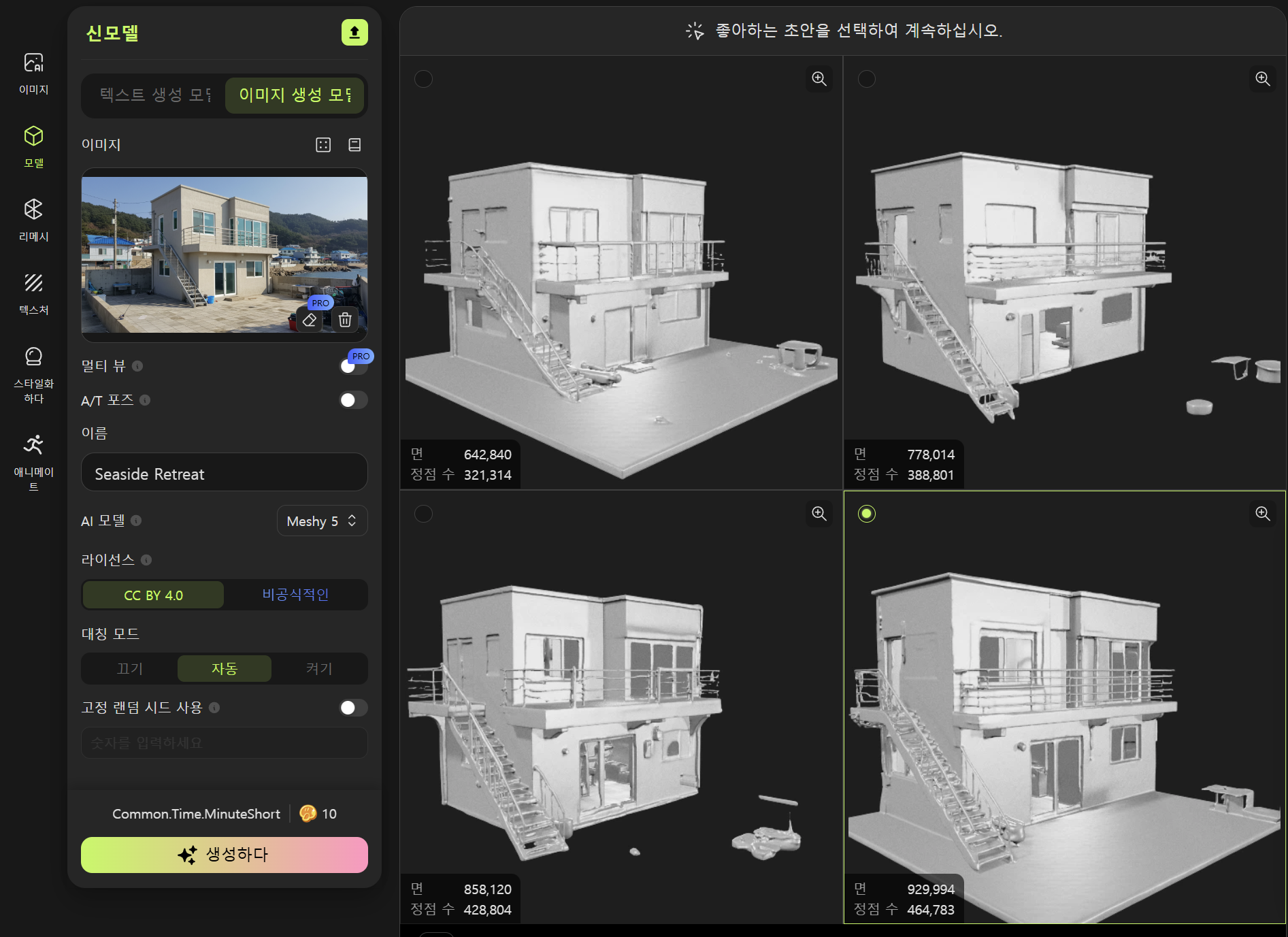 4)우측에서 생성이 완료된 작업 목록을 표시하며 가운데 4개의 뷰에서 생성한 3D 모델을 표시합니다.