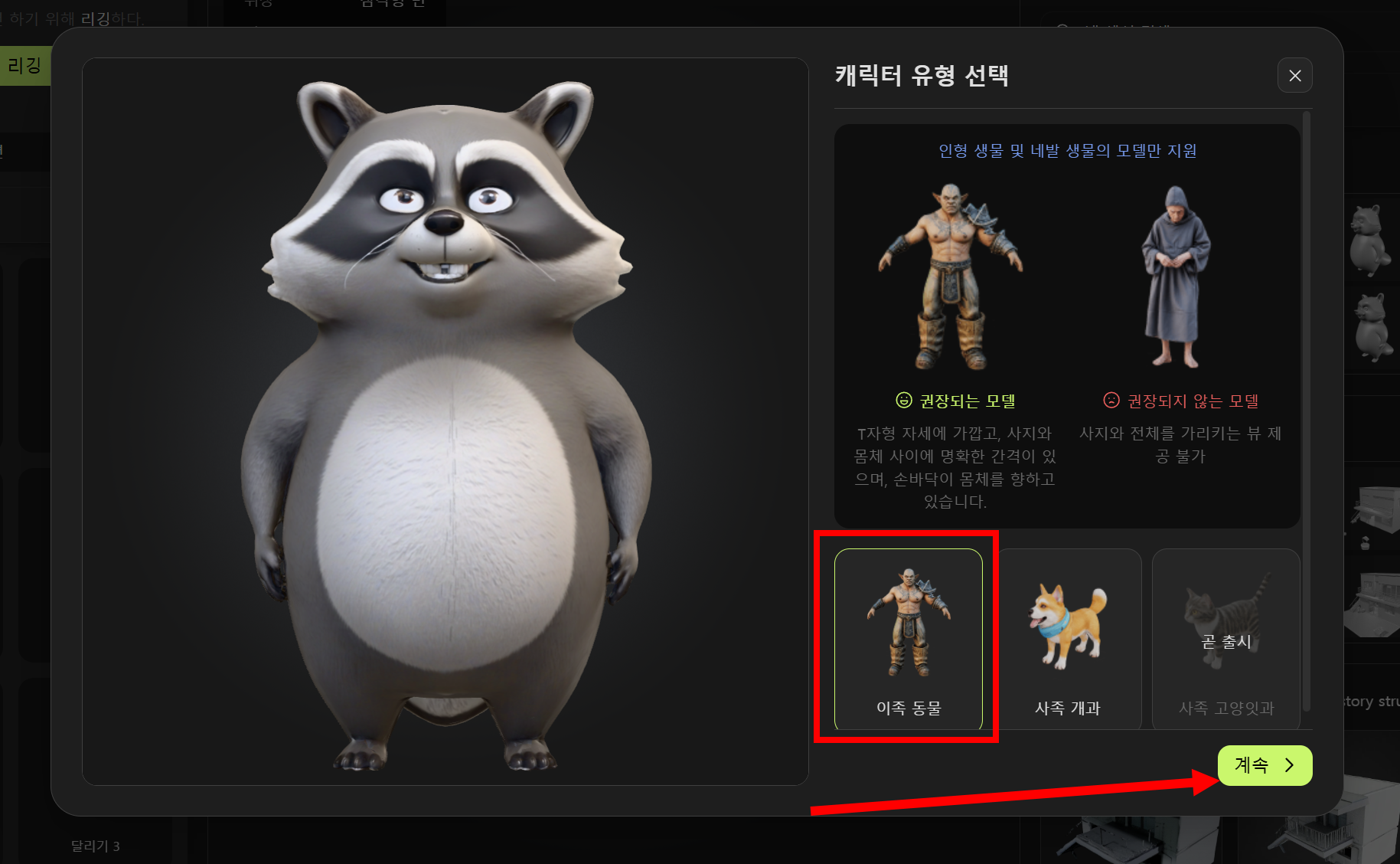 15)캐릭터 유형을 선택합니다(이족 동물, 사족 동물, 기타)