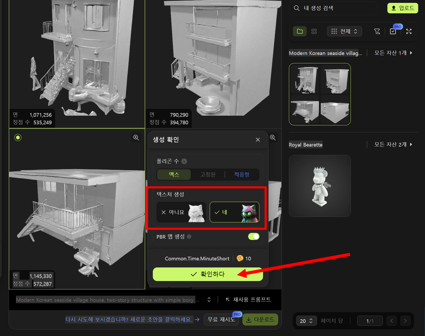 5)모델의 텍스처를 생성하려면 텍스트 생성에 체크하고 확인합니다.