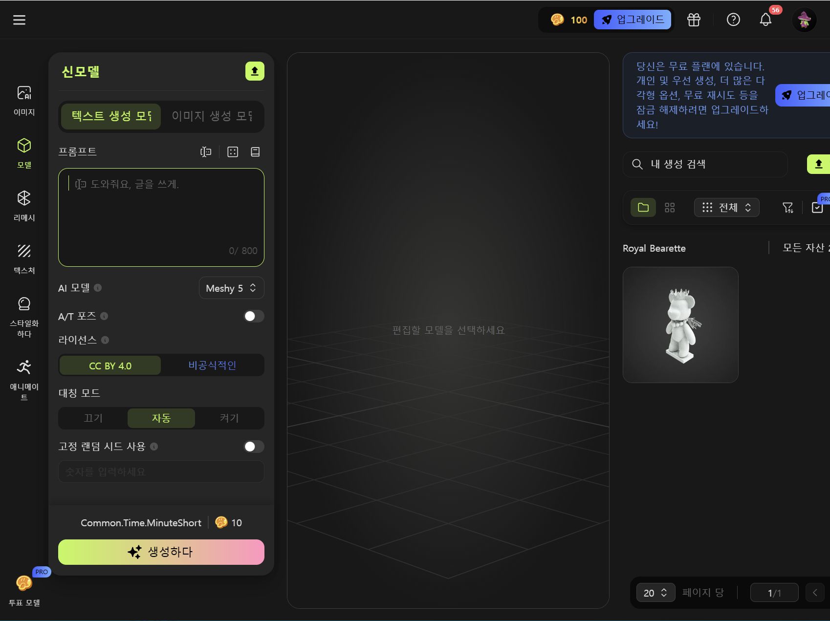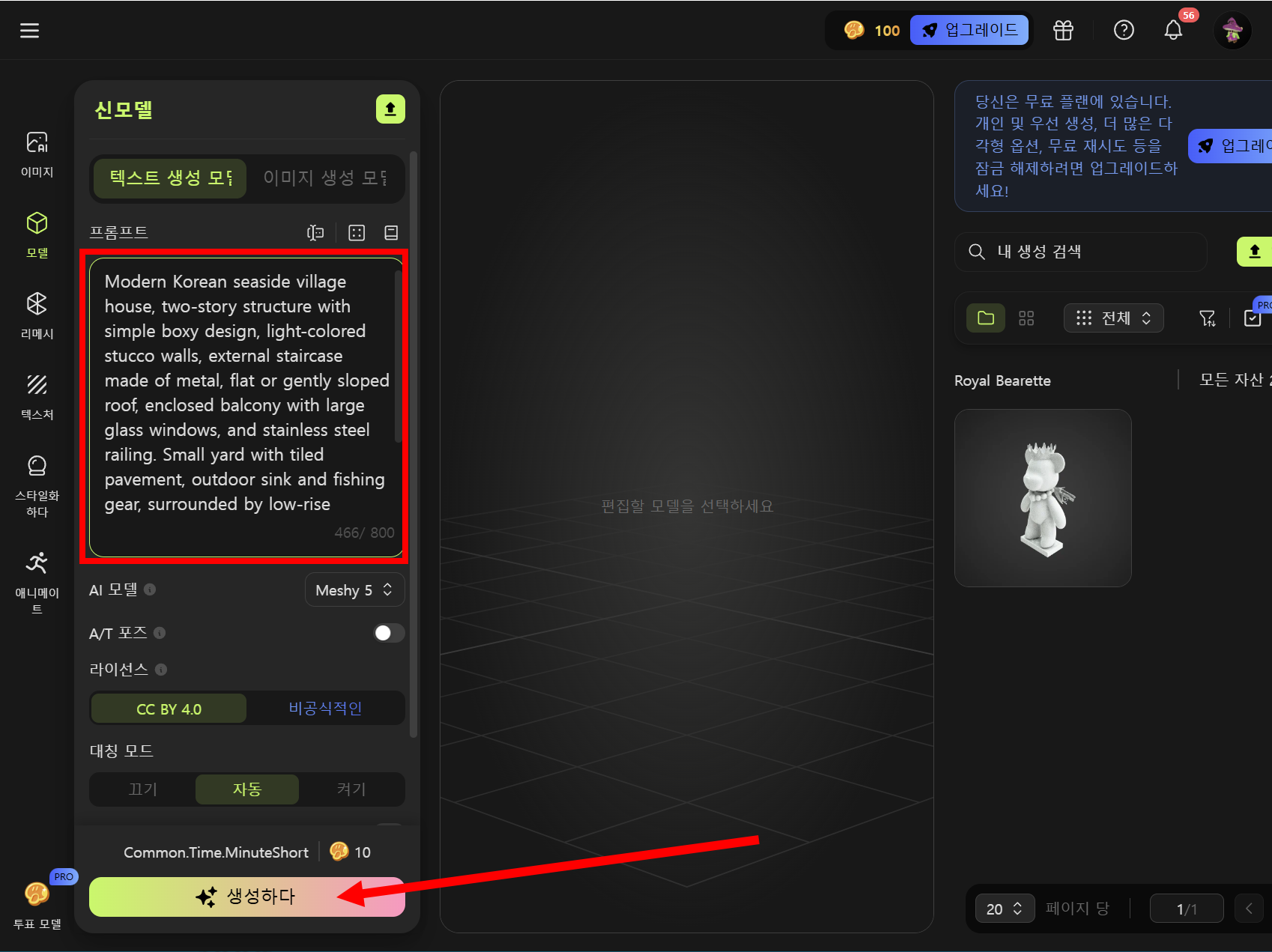 3)좌측에서 3D 모델 생성을 위한 텍스트 프롬프트를 입력하고 생성합니다.