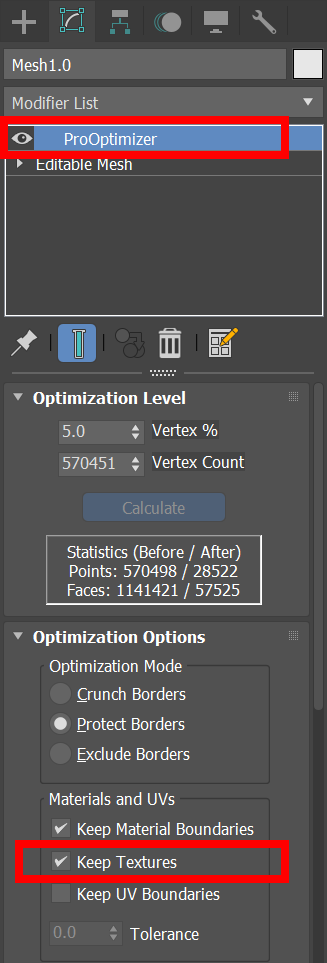 9)3D 맥스의 경우 모델에 ProOptimizer 수정자를 추가하고 Keep textures 옵션에 체크하여 모델의 면의 개수 최적화를 진행할수있습니다.