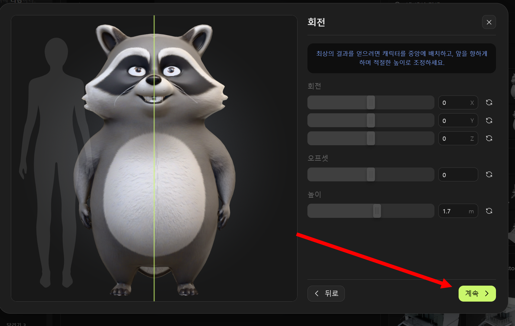 16)캐릭터의 회전, 오프셋, 높이등을 설정합니다.