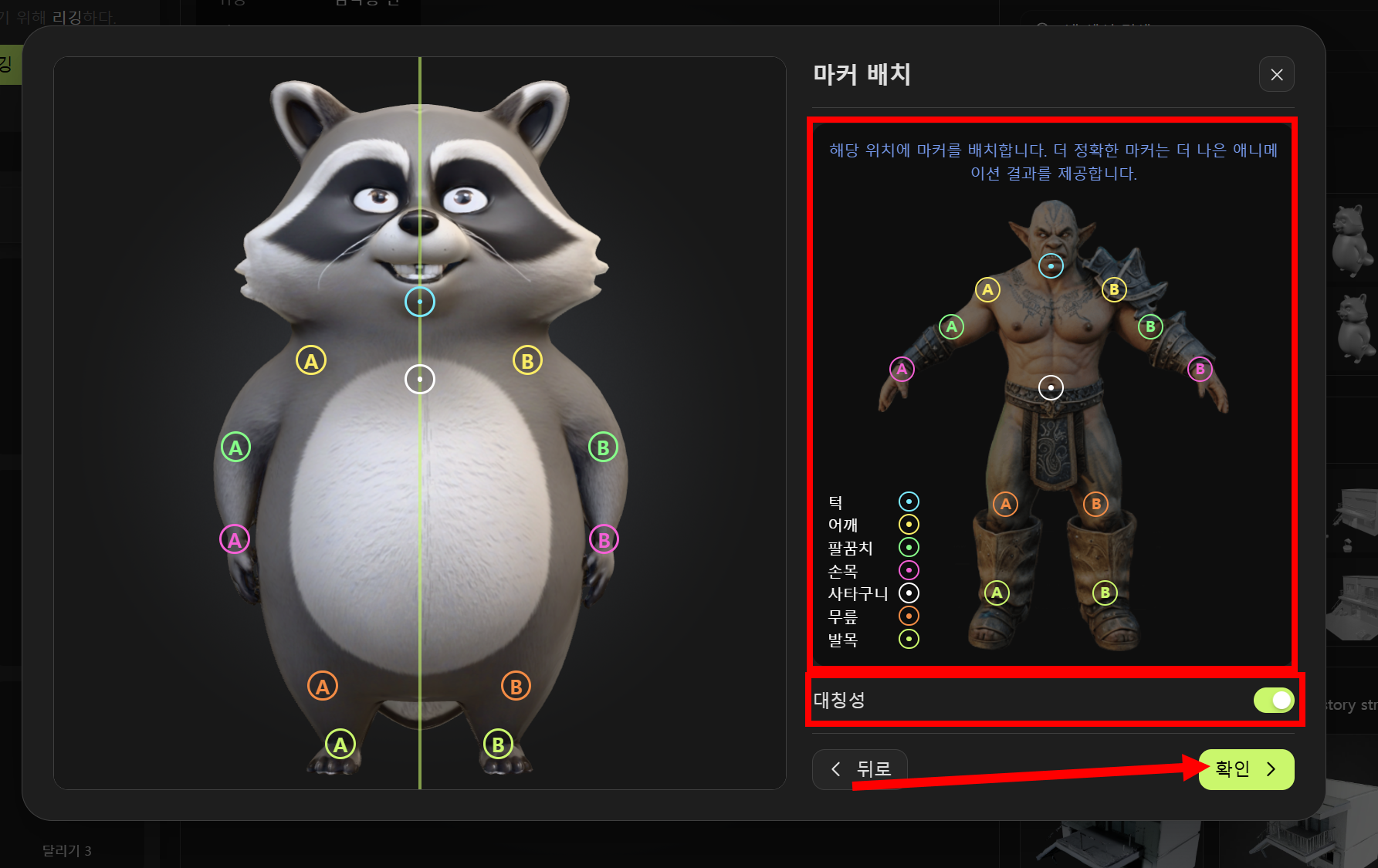 17)레퍼런스를 참고하여 모델에 마커를 배치합니다. 대칭성에 체크하고 확인합니다.