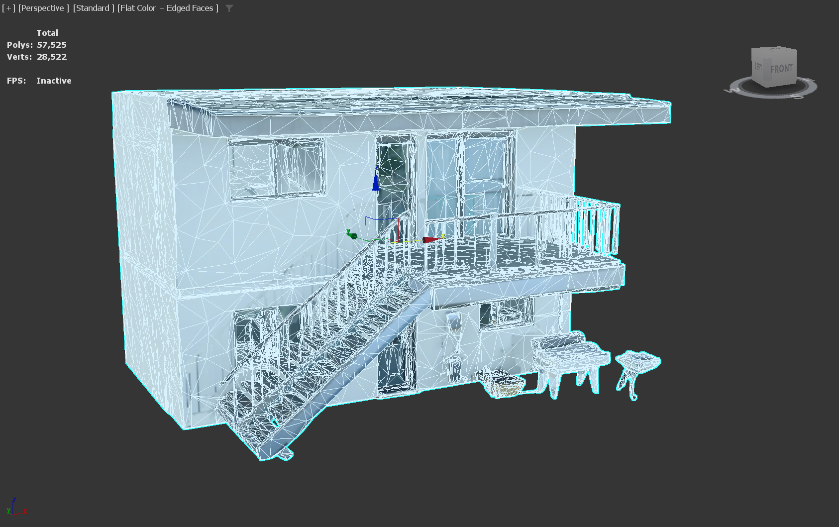 10)모델의 와이어프레임과 면의 개수를 표시하고 면의 개수를 확인합니다(polys, tris, verts)